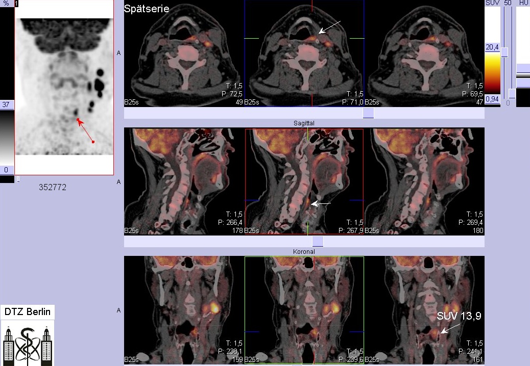 Im PET-CT zeigte sich der Herd „schwach positiv“ und somit verdächtig – mediastinale Lymphknoten schienen aber nicht beteiligt.